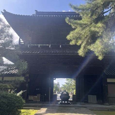 石畳の道に射す光と影が江戸元禄時代から佇むこの山門を額縁のように彩っています。